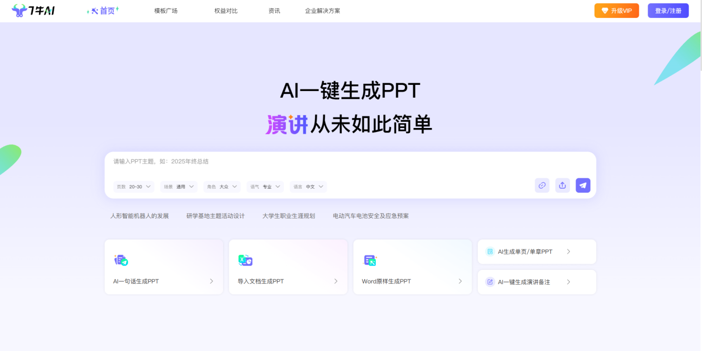 | 7牛AI PPT | 流程简洁、支持多格式导入 | 低 | 中上 | 文档导入生成体验顺畅 | 需要快速将已有文档转为PPT的用户 |